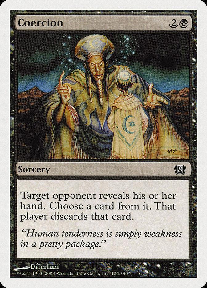 Target opponent reveals their hand. You choose a card from it. That player discards that card.