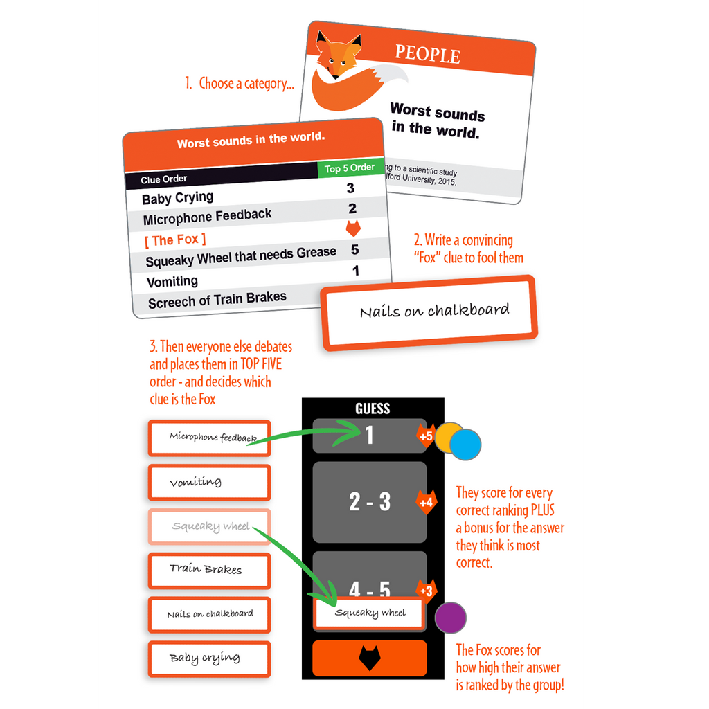 In OUTFOX THE FOX players team up to debate and sequence the order of top 5 lists, but each round, one player inserts a fake answer (THE FOX) among the 5 real ones. It’s like trivia night, but you are given ALL the answers. You and your crew just need to put them in the right order and catch THE FOX in a lie!