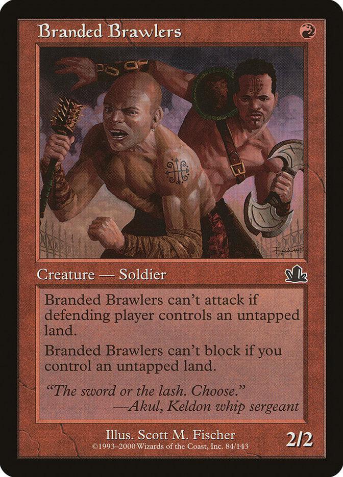 Branded Brawlers can't attack if defending player controls an untapped land.