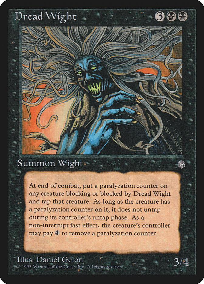 At end of combat, put a paralyzation counter on each creature blocking or blocked by Dread Wight and tap those creatures. Each of those creatures doesn't untap during its controller's untap step for as long as it has a paralyzation counter on it. Each of those creatures gains "{4}: Remove a paralyzation counter from this creature."